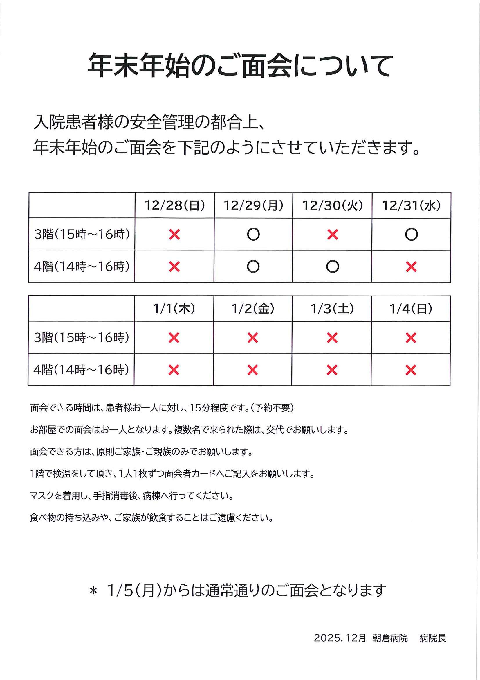 2025年01月06日本日、2024年10月1日より、新型コロナウイルスの感染状況において一時面会を中止しておりました4階病棟の面会を再開いたします。◆4階回復期リハビリ病棟 月~金曜 14:00~16:00 土曜 10:00~11:00注)日曜・祝日は行っておりません。上記の時間内でご家族1名のみ。15分以内で