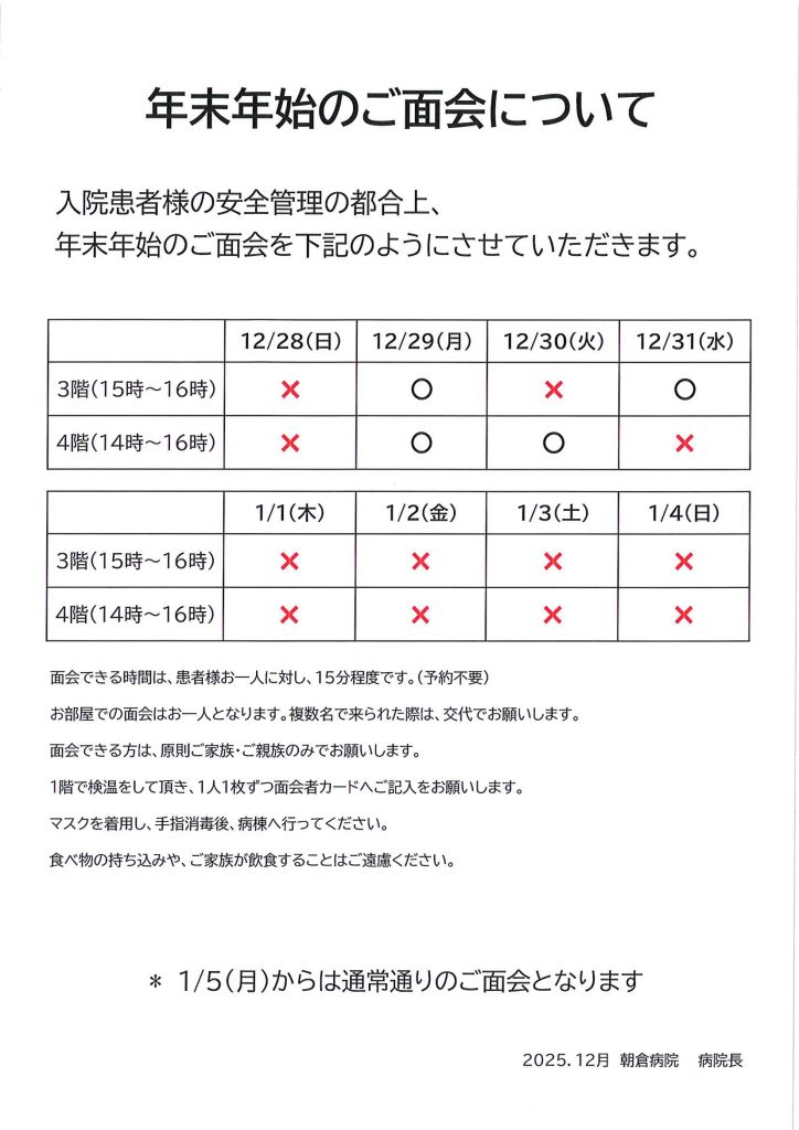 昨年、12月18日に院内の新型コロナウイルス発生により、面会を一時中止しておりました。新型コロナ感染は落ち着き、再開の検討をいたしましたが、現在、インフルエンザの感染が警報レベルと拡大している状況です。